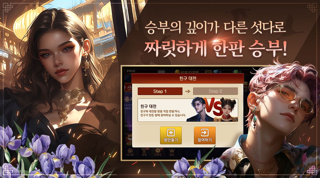 - 실시간 유저 대전으로 전국의 타짜들과 한판 붙어보세요. 친구와 함께 하면 재미는 두 배!